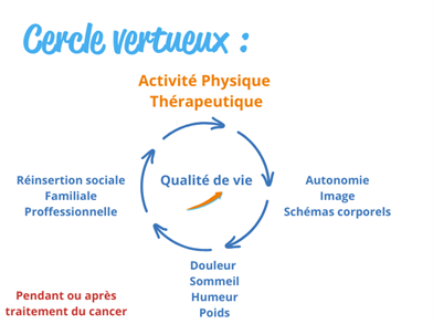 Ces quinze dernières années, de nombreuses recherches ont souligné l'importance de pratiquer une activité physique encadrée (lien vers la page Impact et bénéfices). Concernant particulièrement la douleur, ces études démontrent une réduction significative lorsque l'activité physique est pratiquée conformément aux recommandations officielles. Elle atténue certains effets secondaires des traitements et de la maladie, notamment la douleur.